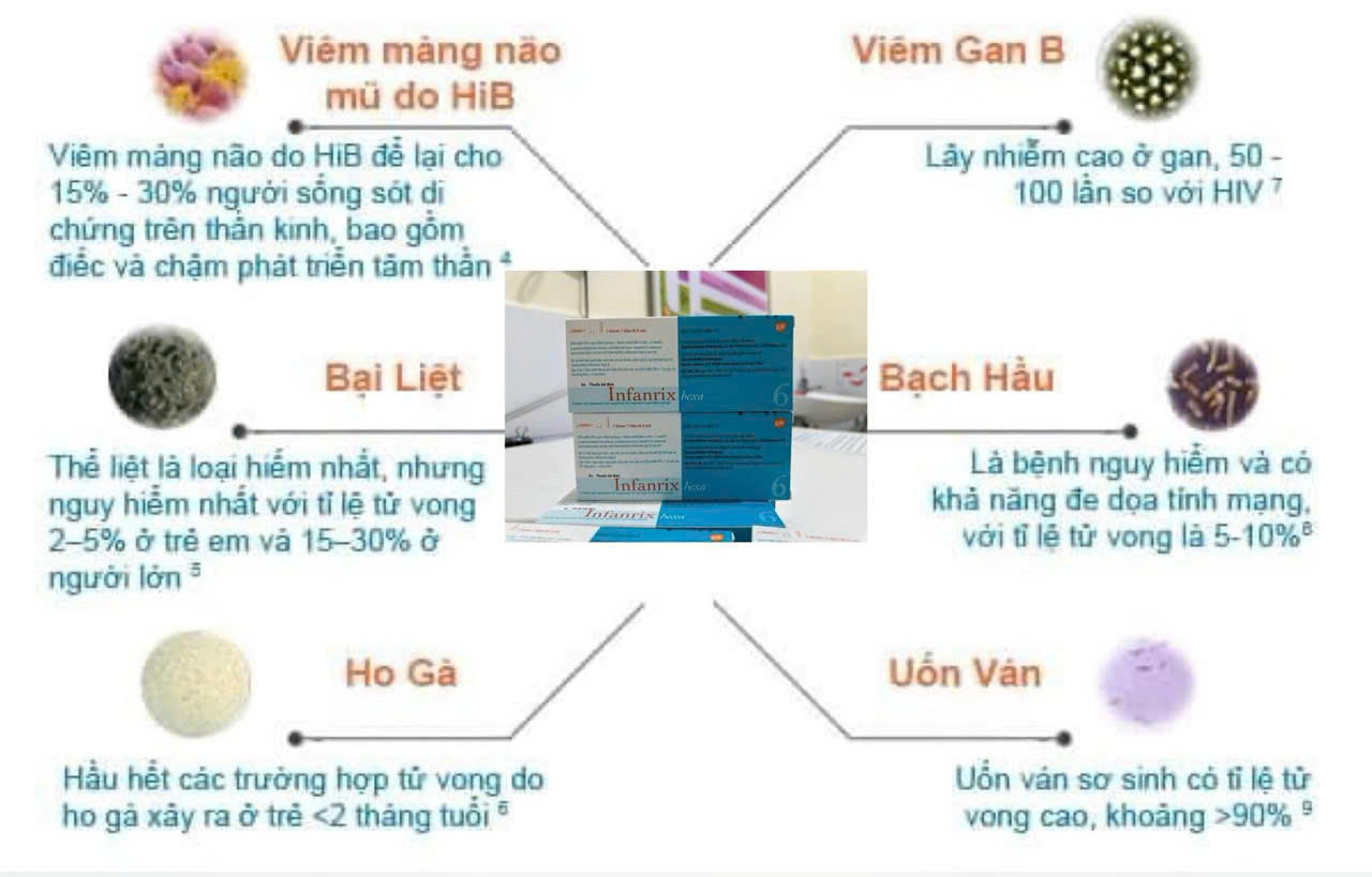 Vắc xin 6 trong 1 là vắc xin kết hợp phòng được 6 bệnh nguy hiểm cho trẻ nhỏ với 1 mũi tiêm: bao gồm: Bạch hầu - Ho gà - Uốn Ván - Viêm gan B - Bại liệt - Viêm màng não do Hib.
